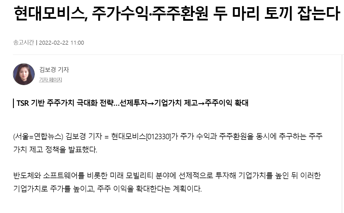 (서울=연합뉴스) 김보경 기자 = 현대모비스[012330]가 주가 수익과 주주환원을 동시에 추구하는 주주가치 제고 정책을 발표했다.