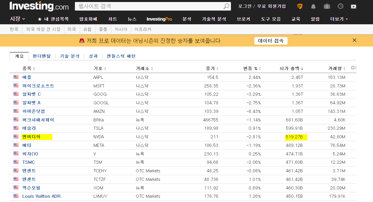 출처: investing.com, 엔비디아 미국 시총 8위