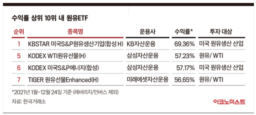[2021년 빛낸 ETF 종목 Top2 ①]<br/>올해 수익률 상위 10개 ETF 중 40%가 원유ETF, 평균 수익률 55% <br/>내년 1~2월까지는 수익률 좋지만 2월 이후 국제 유가 떨어질 듯