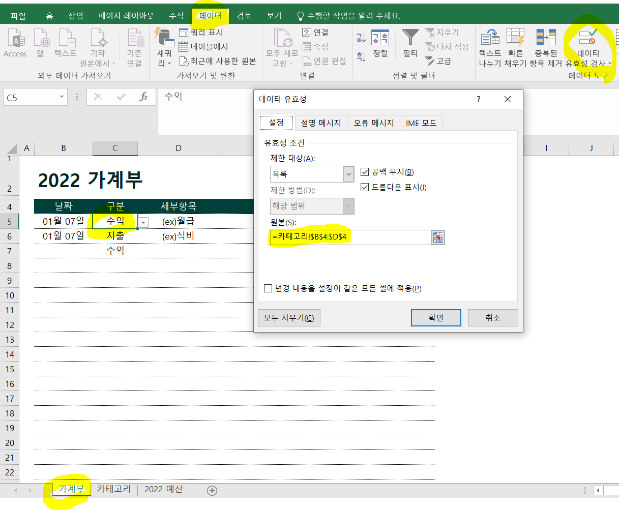 구분 항목의 범위 수정 방법 : C5 클릭 -> 메뉴: ' 데이터' 내의 '데이터유효성검사' 클릭 -> 원본 내 범위 클릭 -> '카테고리' 수익~투자까지 셀을 선택하여 범위 지정. -> 확인 클릭