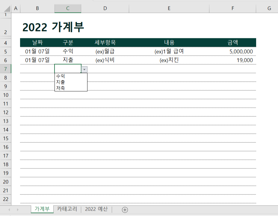 (카테고리 시트는 1번째 가계부 시트에서 드롭다운(버튼) 형태로 자동 선택이 될 수 있도록 수식을 걸어두었습니다.